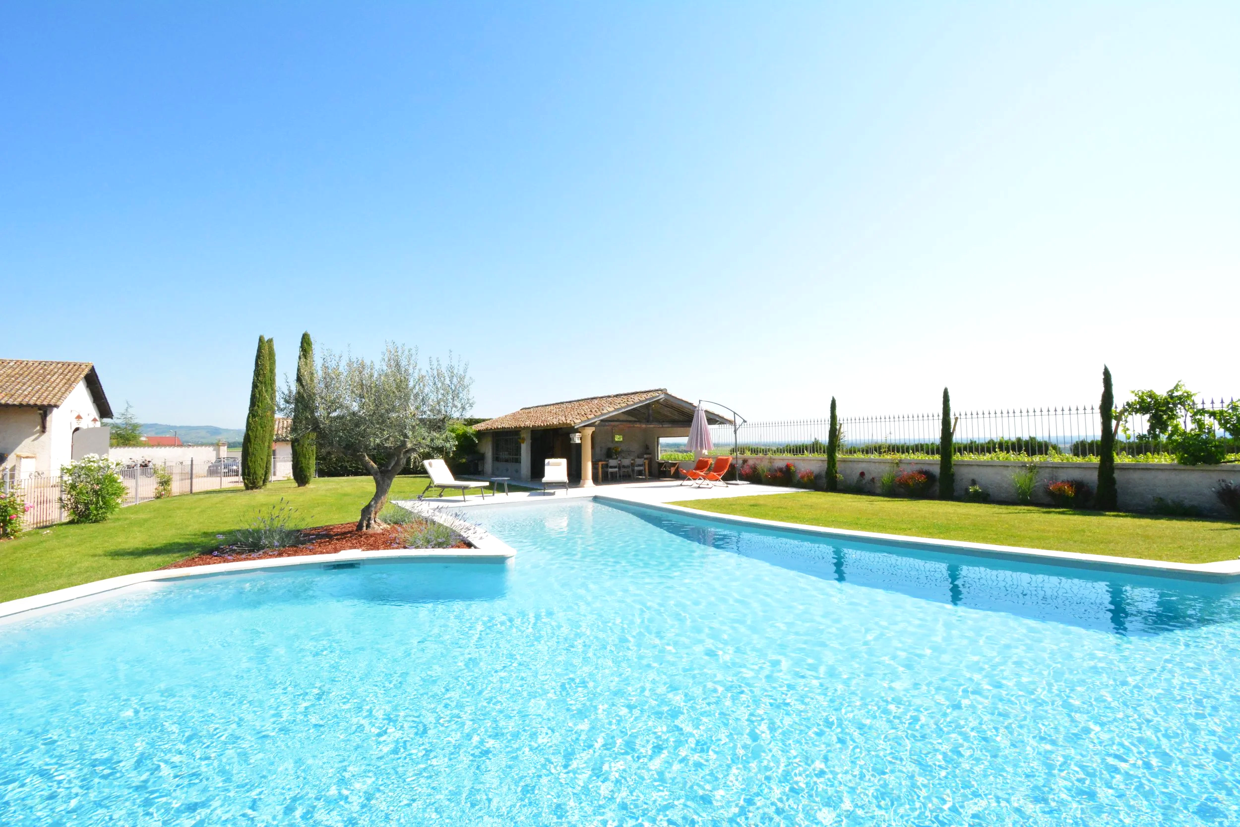 Un accès (règlementé) à la piscine avec vue panoramique sur les vignes beaujolaise et la chaine du Mont Blanc dans un parc de plus 4000 m2